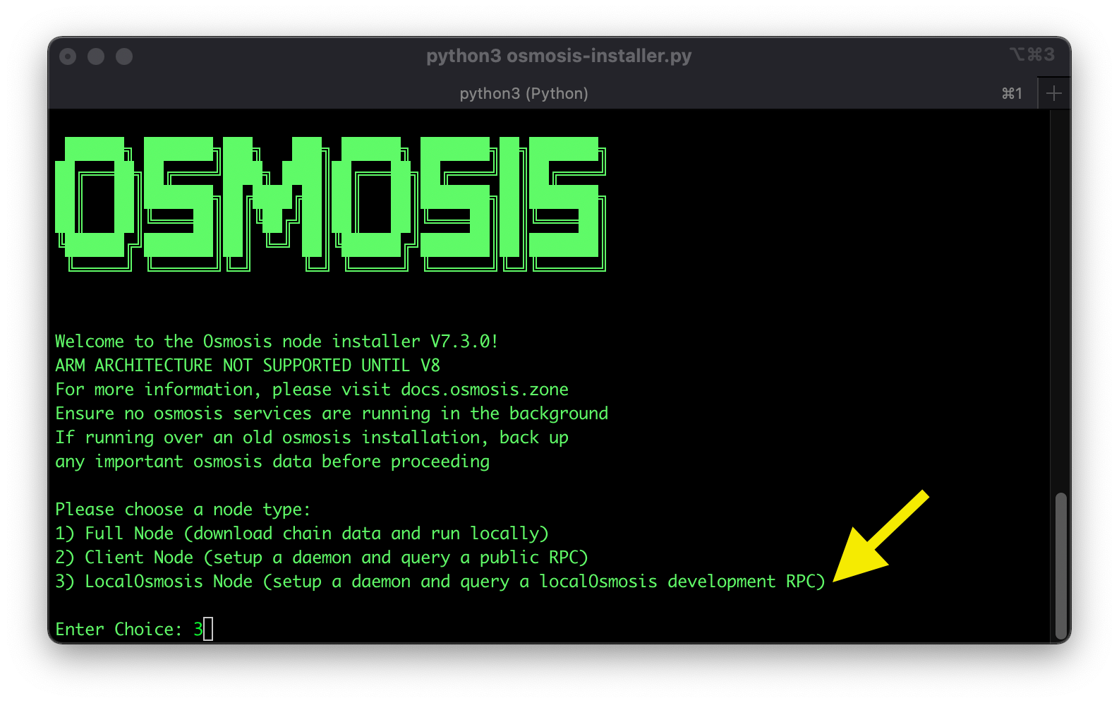 Start the installer with the following command, choose LocalOsmosis (option 3), and follow the prompts: