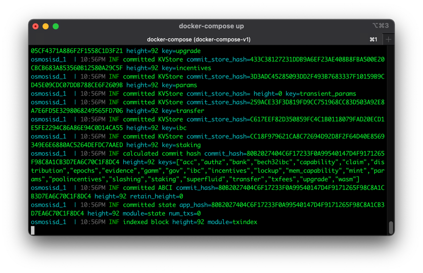 You will start seeing LocalOsmosis block activity in your terminal. Keep LocalOsmosis running while you perform the next steps in a new terminal window.